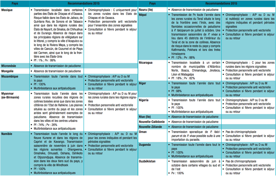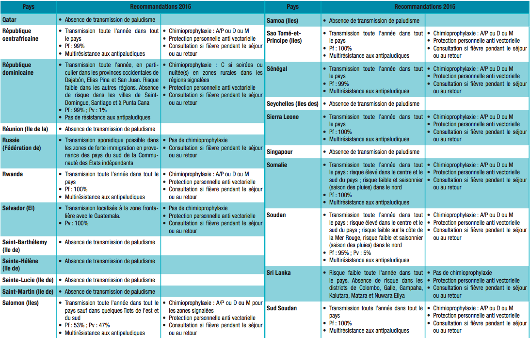 Voici la principale source d'information officielle en France à consulter pour s'informer sur le risque de paludisme dans tous les pays du monde ainsi que les recommandations associées en terme de moyen de prévention : BEH hors-série - Recommandations sanitaires pour les voyageurs, 2016.