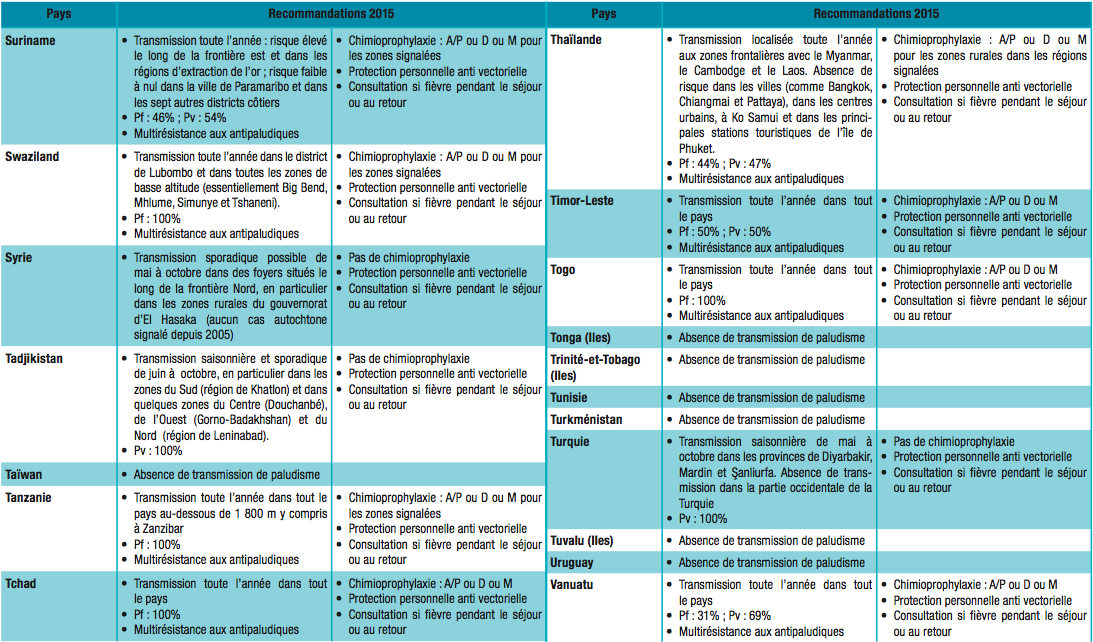 Le document est mis à jour et réédité tous les ans au mois de juin par l'institut de veille sanitaire (le tableau ci-dessous est cependant inchangé entre 2015 et 2016). C'est une source de référence qui sert à la fois aux professionnels de santé et aux institutions publiques qui ont parfois besoin de relayer de l'information sur les risques de paludisme à l'étranger.