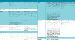 Amérique : Argentine * (pas de cas déclaré depuis 2012 même dans les zones rurales précédemment infectées le long des frontière avec la Bolivie et le Paraguay, et absence de risque aux chutes d'Iguazu), Bahamas (sauf île de Great Exuma suite à quelques cas importés, mais situation sous contrôle), Brésil (sauf Amazonie), Costa Rica * (pas de cas déclaré depuis 2014 et risque très faible uniquement dans province de Limon et pas à Puerto Limon), Equateur (sauf Amazonie), Guyane française (zone côtière sauf Amazonie), Jamaïque * (aucun cas signalé depuis 2010), Mexique (sauf zones rurales du Yucutan et Chiapas principalement), Paraguay * (pas de cas déclaré en 2014 et risque uniquement en zones rurales de l'Est du pays), Pérou (pas de transmission sur la zone littorale et à Lima). De manière générale, toutes les grandes villes du continent américain sont également épargnées sauf en Amazonie.
