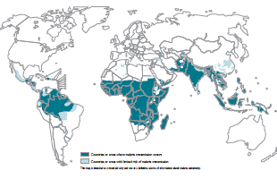 Le paludisme est une maladie présente en 2016 dans 95 pays dans le monde (sur les 196 pays reconnus internationalement aujourd'hui) - Source OMS principalement en zone inter-tropicale et sur tous les continents (sauf Europe) - Ces pays représentent 40% de la population mondiale (3 milliards de personnes). Ces pays sont également visités par plus de 125 millions de voyageurs internationaux chaque année (sur un peu plus d'un milliard de voyageurs internationaux par an).![]() |